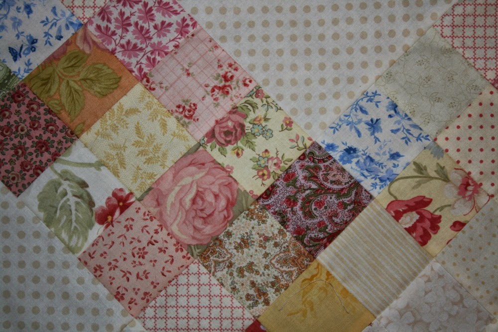 I love your 9-patches and the dotty background fabric you've used. A perfect pairing. I am quite enamored with the 9-patch, and have a handsome stack of hand-pieced ones waiting for the perfect design. This is one to consider. I also have a boxful of them made by my grandmother, also hand-pieced. I really need to be making some decisions!